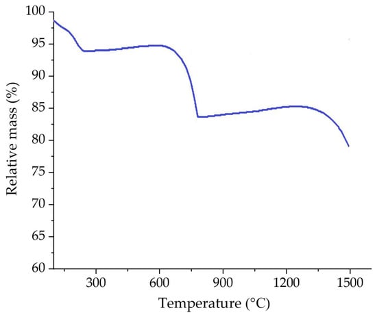 The TGA curve shows two slight mass increases, which are common for barite ores. The first event (from 300 to 600 °C) is related to water contained as an occlusion (the most primitive form of water in minerals). The included water fills the cavities, decreasing its volume, and in the course of heating, the liquid expands again to fill the whole cavities; then, with further heating, its volume increases, and the crystals burst. In addition, the high sulfur content in the Celestine–Barian sample promotes a massive SO2(g) release at higher temperatures (from 750 to 1300 °C), promoting the fact that the sample sputtered from the sample holder [].
