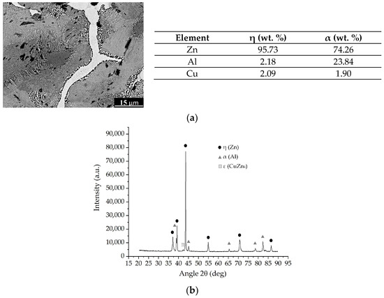 Figure 6a shows a SEM micrograph of the Zn-base alloy, which is constituted of a eutectic microstructure, showing dark and bright areas belonging to the aluminum-rich (α) and zinc-rich (η) phases, respectively. The microstructure shows a fine inter-lamellar structure, characterized by regions of α and η phases. A small copper amount was detected by the SEM-EDS technique, and it was confirmed by the XRD pattern shown in Figure 6b. Furthermore, Figure 6b shows the aluminum-rich (α), zinc-rich (η), and intermetallic (ε) phases corresponding to CuZn4. It has been reported [] that the copper addition to the Zn-Al alloy originates new intermetallic phases (t’ and ε), which increases the strength without affecting the superplasticity of the alloy.