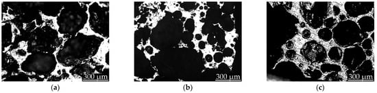 Figure 8 shows representative cell structures of the Zn-22Al-2Cu alloy foams manufactured with barite as a thickening agent. It is evident from Figure 8c that the foam produced with the highest BaSO4 addition exhibits the thicker strut cell, and, hence, the highest relative density with the smallest porosity value.