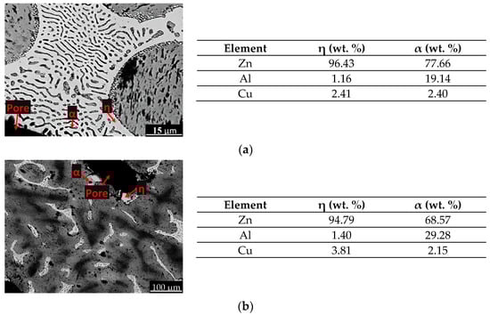At higher magnifications, an interdendritic region of the laminar structure of two phases, α and η, is shown in Figure 9a. A white region is observed, immersed in the eutectic structure, which corresponds to the zinc-rich phase (η), as well as small dark regions that correspond to the aluminum-rich phase (α). The qualitative results showed that the phase (η) corresponding to the white region was Zn-1.16Al-2.41 Cu, while the phase (α) corresponding to the dark region was Zn-19.94Al-2.40 Cu. Figure 9b shows a foam region where the phase (η) that is rich in zinc and the phase (α) that is rich in aluminum are immersed in a eutectic structure. The qualitative results show that the phase (η) is made up of Zn-1.4Al-3.81 Cu, and the phase (α) is made up of Zn-29.28Al-2.15Cu. The rate of cooling imposed by the water spraying did not show any appreciable effect on the final microstructure of the Zn-22Al-2Cu foam, obtaining a typical lamellar eutectic microstructure. Similar behavior was reported in the manufacturing of aluminum-base alloy foams, where the mold was cooled by a fast-blowing airflow []. For both cooling mediums, a solidification rate of 2.0 K/s was estimated in the middle region of the mold. In addition, it must be considered that there are different solidification rates at the different zones of the mold, where the highest cooling rate is expected in the upper part of the mold, as well as higher oxidation and particles formed by the interaction of the thickening and foaming agents with the alloy.