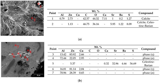 Figure 10 shows the SEM micrographs and EDS analysis of different magnifications of the matrix and particles placed on the metal walls of the foam produced with 1.5 wt. % of barite. The SEM micrographs show the presence of small particles and aggregates that are randomly scattered. The qualitative chemical analysis obtained by EDS for the foams manufactured to 1.0 wt% of CaCO3 and 1.5 wt. % of BaSO4 shows that these foreign particles in the aluminum foams that are produced primarily correspond to the Celestine–Barian (Ba0.25Sr0.75SO4) and unreacted calcite (CaCO3) compounds. However, it has been reported that a high concentration of particles attached to the cell wall is observed when the foaming agent is increased, which corresponds to unreacted calcium carbonate. In addition, the presence of aluminum in the alloy promotes the formation of compounds such as Al4O4C, Al4C3, and CaAl4O7 []. It detected the presence of elements such as Zn, Al, and Cu, which belong to the matrix alloy.