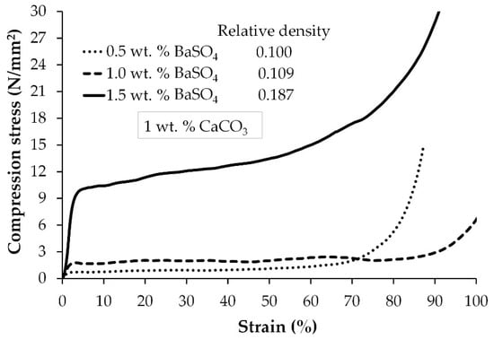 Figure 11 shows the stress–strain compression curves for the Zn-22Al-2Cu alloy foams produced with the addition of barite. The stress–strain curves of closed-cell metallic foams exhibit three distinct zones under compressive loading. The first zone, where stress increases meagerly, corresponds to an elastic stage. The second zone is known as the plastic plateau stage, where a plastic deformation of the cell struts with a slow increase in the stress occurs. The third zone, where the stress increases drastically due to the densification of the collapsed cells, is related to a densification region registered at 50% strain. In general, the compressive curves show smooth behavior in the plateau regions for the foams obtained with the different additions of BaSO4. This behavior is associated with a ductile mechanism, and the failure of ductile foam is controlled by the bending of cell walls []. It is desirable in practical applications that foams show a uniform collapse with a wide plateau regime.