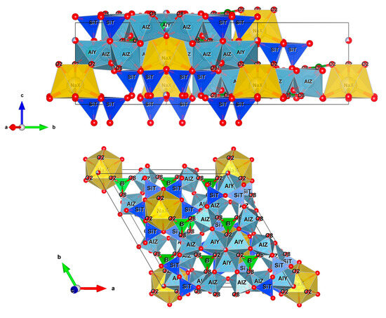 Tourmaline belongs to the subclass of cyclosilicate, which consists of rings of six [TO4] tetrahedra. Six of the more regular [TO4] tetrahedrons form a compound trigonal ring [Si6O18]12− by sharing the two angular tips of each [SiO4] tetrahedron, with the X cation in its central void, which is connected to two classes of octahedrons. The two types of octahedrons are three central [YO6] large octahedrons containing Y ions and six surrounding [ZO6] small octahedrons containing Z ions. Boron atoms are distributed between the major octahedrons, and B forms a [BO3] triangular sheet with an adjacent O2 and two O8, forming a total of three [BO3] atomic groups [2,3,4]. The crystal structure (Figure 1) is quoted in the American Mineralogist Crystal Structure Database [5].