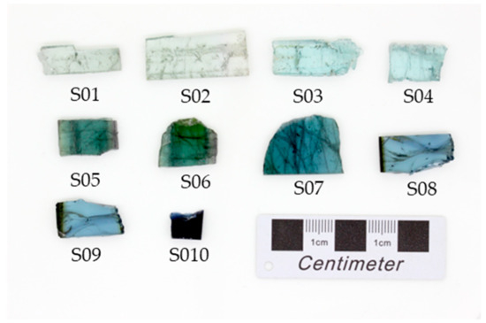 The samples were 10 blue tourmalines of different shades (Figure 2). The samples were obtained from the areas of Governador Valadares and Aracuaí in the state of Minas Gerais, Brazil, both of which are tourmaline-bearing pegmatite deposits. The samples are numbered from S01 to S10, and additional information is given in Table 1.