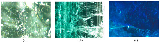 Inclusions of blue tourmaline samples. (a) Fingerprint gas–liquid inclusions of S01 (×80); (b) nearly parallel fractures in the perpendicular c-axis of S05 and tubular inclusions in parallel to the c-axis (×32); (c) gas–liquid inclusions of S10 (×48).