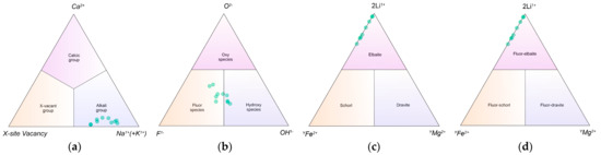 Classification of the chemical composition of blue tourmaline samples. (a) Classification of primary tourmaline groups in the ternary system based on the dominant occupancy at the X-site; (b) classification of general tourmaline species in the ternary system based on the anion occupancy of the W-site; (c) classification of alkali-group tourmaline species in the ternary subsystem; (d) classification of alkali-group tourmaline fluorine species in the ternary subsystem. The above tourmaline composition classification figure was generated by the Wintcac program [20] with the assistance of processing.