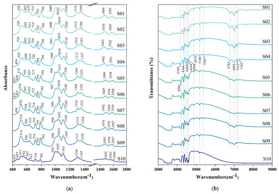 The infrared spectra of the blue tourmaline samples S01 to S10 are shown in Figure 5. The infrared spectra of the 10 tourmaline samples were similar overall, with the mid-infrared spectra mainly showing peak displacement and splitting (Figure 5a), while the near-infrared spectra mainly showed obvious differences in the absorption intensity of the peaks (Figure 5b).