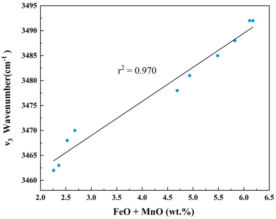 For [OH] hydroxyl vibration, in the crystal structure of tourmaline, three OH groups are connected to two cations at the Z-point site and one cation at the Y-point site, which are called external hydroxyl OH(3), and one OH group is connected to three cations at the Y-point site, which is called internal hydroxyl OH(1). The stretching vibration of the O-H bond corresponds to the range from 3400 to 3800 cm−1, and the absorption peaks below 3600 cm−1 represent the stretching vibration of hydroxyl OH(3) [25,26,27,28]. So, the two or three vibrational bands (e.g., S06: ν1 = 3588 cm−1, ν2 = 3558 cm−1, and ν3 = 3485 cm−1) appearing in this range for S01 to S10 are attributed to OH(3), and the bonding environment is (Fe, Li, Al)YAlZAlZ [29]. Compared with ν1 and ν2, ν3 exhibits a stronger and broader band. From S01 to S10, ν3 gradually shifts to a higher wave number with the increasing FeO + MnO content (Figure 6), and the two show a significant positive correlation (r2 = 0.97).