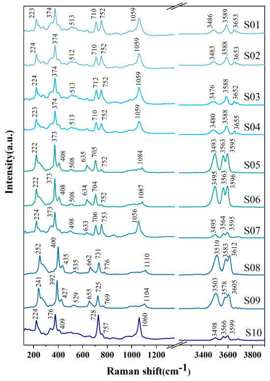 The Raman spectra of blue tourmaline samples S01 to S10 are tested in Figure 7.