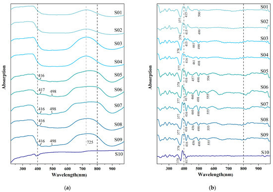 As the absorption peaks within the visible region of 400–800 nm are difficult to calibrate, second-order derivative spectra (Figure 8b) were used to separate them for more accurate localization [37]. Second-order derivative spectroscopy improves the resolution of the raw spectral signals but also makes the spectral noise increase, and the peaks were smoothed to facilitate analysis and comparison. It should be noted that all samples show false absorption peaks around 400 nm, which is due to the discontinuous switching of the light source. Although the derivative spectra of S10 show a series of wave-like symmetric peaks, only the absorption below the baseline at 417 nm is a reliable absorption peak.