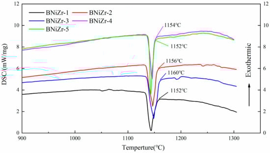 The heating curves of filler powders tested by DSC are shown in Figure 1. As can be seen from Figure 1, the main heat absorption peaks of fillers all end below 1160 °C. In order to ensure that the filler exhibits excellent fluidity during brazing, the brazing temperature is set at 1200 °C, approximately 40 °C above the end of the main heat absorption peak. Additionally, the brazing time is set to 30 min.
