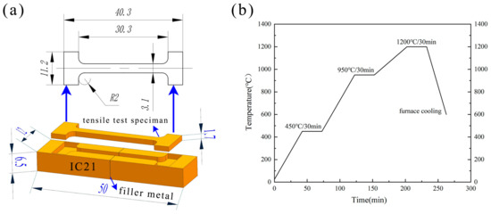 The IC21 alloy was cut to 12 × 6.5 × 25 (mm) using wire cut electrical discharge machining (WEDM) before brazing, and the face of 12 × 6.5 (mm) was the brazing surface (Figure 2a). After cutting, the brazing surface was polished using 600-grit sandpaper and ultrasonically cleaned in acetone for 10 min to remove the oil on the workpiece. When assembling, nickel wire was utilized to maintain the weld gap at 50 μm, followed by the use of an energy storage welding machine to position the parts to be brazed. When preparing the brazing paste, the mass ratio of filler to Canadian resin to acetone was set at 10:1:20. The modulated filler paste was applied to the weld, and the sample was put into the vacuum furnace after drying. As shown in Figure 2b, the brazing temperature was 1200 °C, with a hold time of 30 min. The vacuum level of the vacuum furnace was maintained at less than 1 × 10−4 Pa. The samples were cooled in the furnace to below 200 °C after heating.