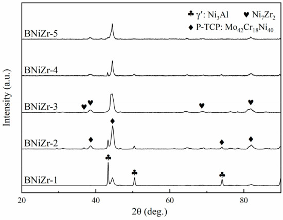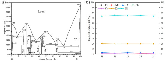 According to the analysis in Section 3.1, the ASZ is mainly composed of Ni7Zr2, TCP, and γ+γ′ eutectic. Compared to J1, J2, and J3, with the increase in Zr content, the amount of Ni-Zr phase in the joints progressively increases. According to the Ni-Zr binary phase diagram (Figure 14a), when the atomic proportion of Zr in the Ni-Zr system is (16–27.5) at. % at 1200 °C, the Ni-Zr phase all exists in the form of Ni7Zr2. EDS analysis was performed on Ni-Zr phase of five joints, and the changes in compositions of Ni-Zr phases are shown in Figure 14b. It can be seen that the changes in Ni and Mo in filler did not affect the compositions of Ni-Zr phases obtained by brazing at 1200 °C for 30 min. This result demonstrates that the Ni-Zr phases present in the five brazed joints exist primarily in the form of Ni7Zr2.