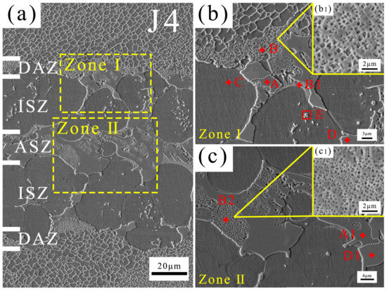 Microstructure of J4 (a), Zone I (b), and Zone II (c) of (a).
