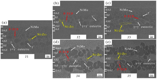 For J1, J2, and J3, the increase in Zr content in the joint leads to an increase in Ni7Zr2 in the ASZ, as shown in Figure 7. Consequently, the proportion of ASZ width increases with the increase in Zr content. Similarly, for J1, J4, and J5, an increase in Mo content also results in a higher presence of the P-TCP phase in the joint. Therefore, with the increase in Mo content, the proportion of ASZ width increases as well.