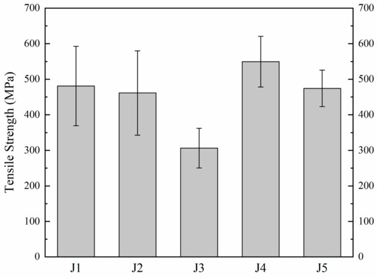 The tensile tests of five kinds of samples brazed with different brazing fillers are conducted at 980 °C, and the test results are shown in Figure 8. The tensile strength of J1 is 481 MPa at 980 °C. With the increase in Zr in the filler, the tensile strength of J2 decreases to 461 MPa. When Zr in the filler continues to increase, the tensile strength of J3 decreases to 307 MPa. In comparison to J1, an increase in Mo content results in elevated tensile strength for J4, reaching 550 MPa at 980 °C. However, as the Mo content further increases, the tensile strength of J5 declines to 474 MPa. This trend indicates an initial rise followed by a subsequent decrease in joint tensile strength with increasing Mo content at 980 °C.