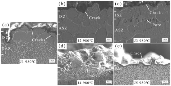 The tensile fracture morphologies of joints at 980 °C were observed by SEM (Figure 9). The fracture site of J1 (Figure 9a) is located in the periphery of the γ′ phase. As the Zr content increases, J2 fails at the interfaces of ISZ and DAZ (Figure 9b). With further increases in Zr content, besides failure at the interfaces of ISZ and DAZ, pores are also found in the ASZ of J3 (Figure 9c). Upon increasing the Mo content, it is observed that both J4 (Figure 9d) and J5 (Figure 9e) fail at the interfaces of ISZ and DAZ, with the fracture surface of J5 being smoother.