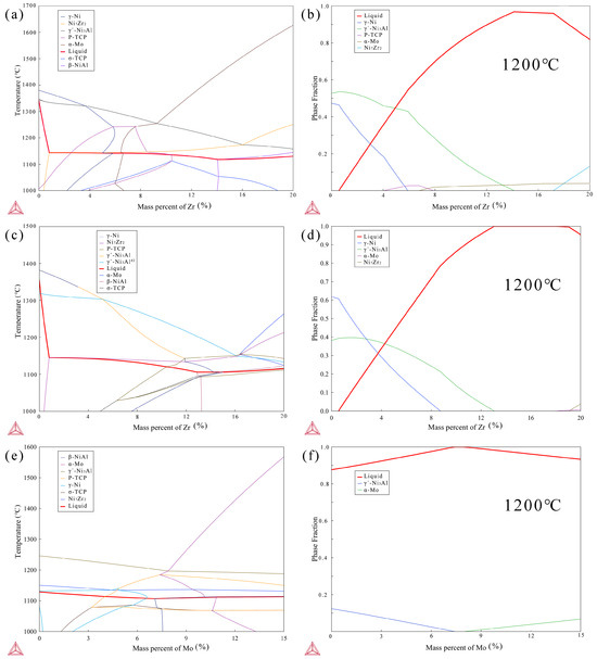 Phase diagram (a) and mole fraction (b) of IC21 alloy with Zr addition at 1200 °C, phase diagram (c) and mole fraction (d) of BNiZr-1 filler with adjustment of Zr at 1200 °C, phase diagram (e) and mole fraction (f) of BNiZr-1 filler with adjustment of Mo at 1200 °C, calculated by Thermo-Calc.