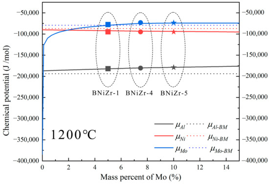 The chemical potentials of elements after adjusting Mo in the BNiZr-1 filler and the chemical potentials of elements in the BM and the fillers at 1200 °C.