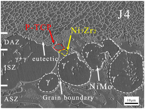 The microstructure of the joints brazed with five fillers are shown in Figure 7. According to the cross-sectional microstructure images in Figure 7a, numerous granular NiMo phases can be observed in the DAZ of J1 (Zr content of filler: 11.8–12.2 wt.%). γ+γ′ eutectic, P-TCP, and Ni7Zr2 are observed in the ASZ. The P-TCP phases are marked by red arrows and dashed lines, while Ni7Zr2 phases are marked by yellow arrows and dashed lines. Increasing the Zr content to 13.8–14.2 wt.% in the BNiZr-2 filler results in an increase in the Ni7Zr2 phase within J2, while reducing the number of granular NiMo phases in the DAZ. Moreover, when the Zr content in the BNiZr-3 filler increases to 15.8–16.2 wt.%, the size of the Ni7Zr2 phase in J3 significantly increases compared to J2.