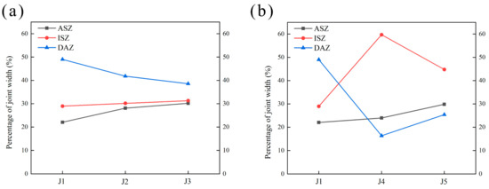 The percentage of the width of each area to the width of the joints. (a) Adjusted Zr, (b) adjusted Mo.