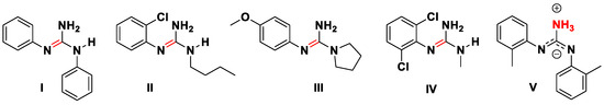 - Brown, C.J.; Gash, D.J. N,N’-Bis(2-methylphenyl)guanidine, C15H17N3. Acta Crystallogr. Sect. C 1984, 40, 562–564. [Google Scholar] [CrossRef]