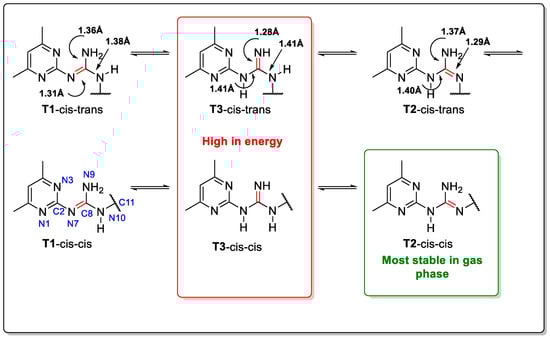 Overall, gas-phase calculation indicated tautomer T2 with a cis–cis geometry to be most stable for compounds 1–9, while n-butyl derivative 10 appeared most stable as tautomer T1-cis–trans with a low margin. Derivatives 11–12, having cyclic secondary amine substituents, are also indicated to be most stable as tautomer T1. Note that the T2 structure is prohibited by the lack of a proton at this side. Tautomer T3 was found to be 15–17 KJ/mol higher in energy. Tautomer T1-cis–trans was relatively stable for the non-aniline structures 5–12 (see Supplementary Materials, Table S7), but high in energy for the aniline structures. Additionally, the tautomer stability of five guanidines (comp. 1, 3, 4, 5, and 8) was also computationally evaluated, with other basis sets and density functionals showing similar trends (Supplementary Materials, Table S8). The average of the calculated bond lengths is shown in Figure 2. No significant difference in bond length was seen between the cis–cis and cis–trans forms of the tautomers (Supplementary Materials, Table S9). Pyrimidines are potential hydrogen bond acceptors. The distance between the pyrimidine atom N3 (hydrogen bond acceptor) and N9 (hydrogen bond donor) was indicated to be within distance for medium strength hydrogen bonding (Supplementary Materials, Table S9). The average distance between N3 and N9 was 2.67 Å, 2.76 Å, and 2.91 Å for T1, T2, and T3 structures, respectively. This could indicate stronger hydrogen bonds for the T1 tautomers, as compared to the others. The Moltaut program [36] predicted tautomer T1 to be most stable in 10 of the 11 cases tested (Supplementary Materials, Table S10). The program was not able to handle the larger molecule 12. Furthermore, to indicate the effect of electronic properties of the different amine substituents, the proton affinities of the guanidines were calculated using B3LYP/cc-pVDZ (Table S11). The correlation with the experimental pKa values was reasonably good (R2 = 0.952, Figure S19).