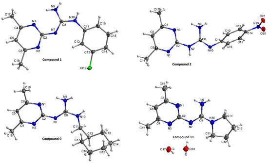 The solid-phase structures of guanidines 1–12 depend on the amine substituents and can broadly be classified in two groups. The bond length data are shown in Table 2, while representative X-ray structures are displayed in Figure 3 and in Supplementary Materials, Figures S1–S19.