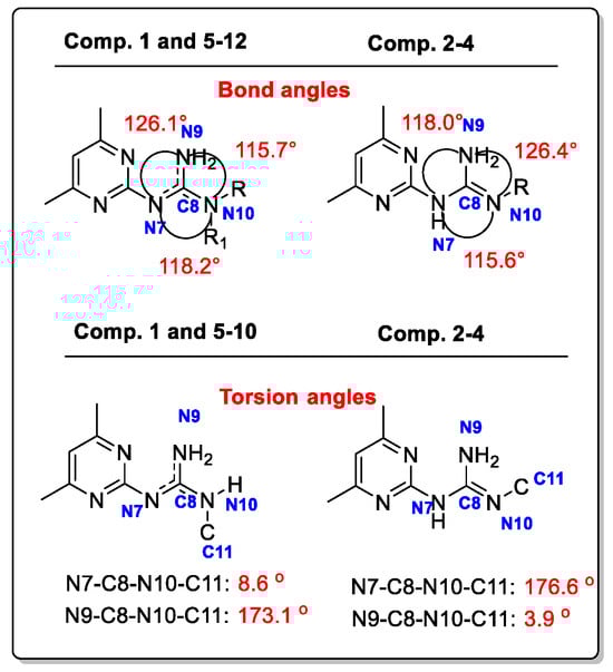 These bonds are approaching single- and double-bond character, respectively, and the visualisation of tautomer T2 with a cis–cis geometry, as shown in Figure 2, is descriptive. The anilines used in the preparation of these three molecules have pKa < 3.2. Thus, the electronic properties of the substituents appear to play a major role in determining the tautomer type. The bond and torsion angels for the central part of the molecules are visualised in Figure 4 and in Supplementary Materials, Tables S5 and S6. For compounds 1 and 5–12, the following average bond angles were observed: N7-C8-N9: 126.1 ± 0.6°, N7-C8-N10: 118.2 ± 0.8°, and N9-C8-N10: 115.7 ± 1.3°. The bond angles for guanidines 2–4 are very similar, but they are arranged in an opposite way, being N7-C8-N9: 118.0 ± 0.2°, N7-C8-N10: 115.6 ± 0.4°, and N9-C8-N10: 126.4 ± 0.3°.
