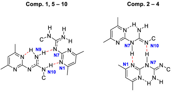 One possible explanation for the bond length averaging especially seen for compounds 1 and 5–12 could be intramolecular hydrogen bonding leading to semi-aromatic substructures. Such a phenomenon has been explained by resonance-assisted hydrogen bonding [17,18,19]. In all of the X-ray structures, intramolecular hydrogen bonding involving the central N9 atom as a donor and pyrimidine N3 as an acceptor is indicated. The distance between N3 and N9 is in the range expected for hydrogen bonds (average value for all compounds, 2.68 Å), but the interatomic distances (2.66–2.71 Å) are not shorter for these molecules in comparison with guanidines 2–4. Thus, resonance-assisted hydrogen bonding is not likely to explain the X-ray tautomer forms for 1 and 5–12. However, the intermolecular hydrogen bonding in the crystals differ. The cis–trans geometry of guanidines 1 and 5–10 dictate that two hydrogens (on N9 and N10) are heading in the same direction, providing two interaction sites. Atoms N1 and N7 in a neighbouring molecule are in perfect distance to be acceptors of these hydrogen bonds. This leads to the formation of infinite chains in the structure connected by hydrogen bonds (see Figure 5).