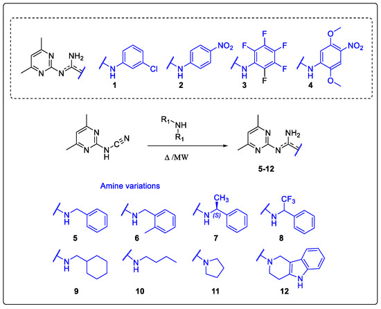 In a microwave vial (20 mL), N-(4,6-dimethylpyrimidin-2-yl)cyanamide (1 equiv.) and an amine derivative (1 equiv.) in dioxane (15 mL) were mixed and heated under microwave irradiation at 150 °C for 1 h. The reaction mixture was cooled to 22 °C and added to a basic solution (2% NH3 in 50 mL water). The precipitate that formed (pH: 11) was isolated by filtration, washed with water, and dried under vacuum to obtain the target compounds. For some compounds, the attained solid was further purified by recrystallisation from 2-PrOH, and the obtained crystals were used for X-ray crystallographic analysis.