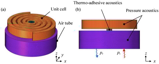Acoustic finite element simulations have been widely used in the design of acoustic metamaterials to improve the research efficiency while reducing the cost of experiments [42]. Figure 2 presents the numerical model and meshing of a spatial double helix resonator based on the finite element method (implemented in COMSOL Multiphysics 6.2) for evaluating the absorption coefficients of the spatial double helix resonator. The numerical model consists of a unit cell and an air tube, which acts as a medium for the propagation of sound waves and interacts with the unit cell and the entire resonator. The combination of the unit cell and the air tube can accurately simulate the propagation and absorption of sound waves in this acoustic system. The sound pressure amplitude of the air tube is 1 Pa, and its sound pressure distribution is controlled by the Helmholtz equation [43].