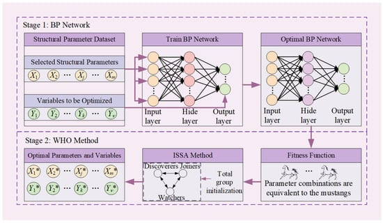 The overall framework of the optimization model proposed in this paper is shown in Figure 3. In the first stage, a BP network is used in the optimization to construct the mapping relationship between the structural parameters and the acoustic performance of the resonator. The nonlinear relationship between the structural parameters and the target acoustic performance is accurately captured through training to provide effective constraints for subsequent optimization. The second stage uses the constraints from the first stage combined with the Mustang optimization algorithm to minimize the size of the resonator while maintaining the acoustic performance.