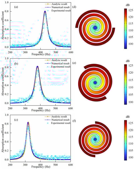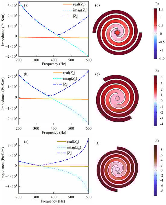 In order to verify the accuracy of the model more deeply, a comparison of the sound absorption performance of the analytical, numerical, and experimental models was carried out. Table 3 shows the three groups of different structural parameters of the SDHR. The sound absorption coefficients corresponding to the three different sets of structural parameters are shown in Figure 5a–c, respectively. The results show that the analytical and numerical models were well-matched. The peak absorption coefficients of the analytical model were 0.803, 0.823, and 0.833, corresponding to the frequencies located at 430 Hz, 382 Hz, and 320 Hz, respectively, and the peak absorption coefficients of the numerical model were 0.806, 0.827, and 0.835, corresponding to the frequencies located at 429 Hz, 381 Hz, and 318 Hz, with an error of no more than 0.17%. The peak values of the sound absorption coefficients of the experimental model decreased relative to the previous two, which were 0.730, 0.736, and 0.737, corresponding to the frequencies located at 431 Hz, 379 Hz, and 320 Hz, respectively. The distribution of the sound pressure level of the SDHR at the resonance frequency is shown in Figure 5d–f. The maximum value of the sound pressure level occurred internally due to the resonance generated by the double-helix channel, which indicates that the double-helix resonator performed satisfactorily in noise reduction. An ideal rigid wall was assumed in the analytical and numerical modeling. In contrast, some acoustic waves penetrates the material in the experiments, leading to acoustic leakage because the experimental samples were not completely rigid. Due to these defects, the experimental results showed fluctuating contours instead of the relatively smooth curves in the simulation. In order to investigate the noise reduction principle of the model further, the acoustic impedance at the entrance of the model and the model acoustic pressure map were extracted, as shown in Figure 6. It can be clearly seen that the acoustic impedance at the resonance frequency was 1518.4 Pa-S/m, 1464.3 Pa-S/m, and 1390.4 Pa-S/m, respectively, and the corresponding acoustic pressure plots are shown in Figure 6d–f, where the acoustic pressure at the inlet was close to 0 Pa. Due to the thermo-viscous loss, the acoustic impedance and acoustic pressure at the inlet were non-zero.