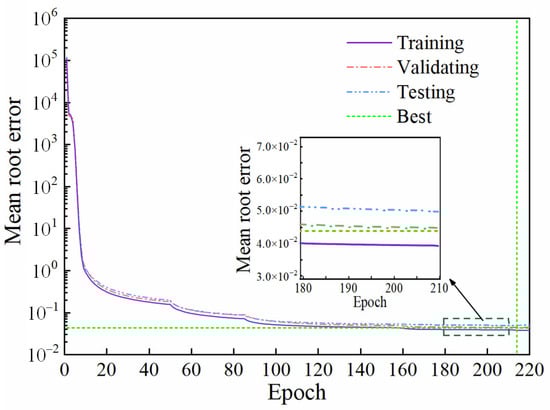 In the optimization model, the accuracy of the results of the BP network is critical. Its regression state is shown in Figure 7a and was achieved by comparing and analyzing the predicted values with the real values of 100 different parameter combinations in the test set. The results show that the regression performance of the prediction model was very excellent, and its maximum fitting coefficient R2 reached 0.9998. The errors of the training set, validation set, and test set were further analyzed. Figure 7b shows a normal distribution, and the error value was minimal, indicating that the model prediction accuracy met the expected requirements. The mean square error (MSE) functions of the model training set, validation set, and test set are shown in Figure 8. The model converged quickly in the first 10 training epochs, and the MSE value decreased slowly in the subsequent training, stabilizing after 216 training epochs with a final training epoch of 220. The MSEs for training, testing, and validation were 4.02 × 10−2, 5.06 × 10−2, and 4.71 × 10−2, respectively.