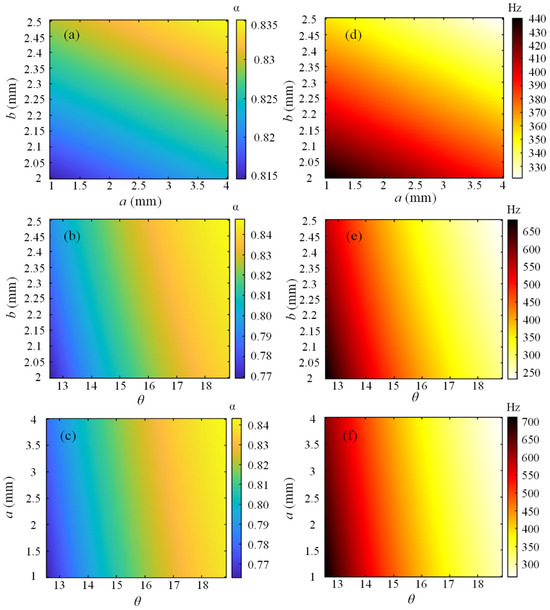 The structural parameter directly effects the maximum value of the sound absorption coefficient αmax and the resonance frequency. Therefore, the influence pattern was calculated as shown in Figure 9. Fixing the pole angle constant, the increase of parameters a and b increases the peak value of the absorption coefficient and corresponding frequency, and the effect of parameter b is slightly larger than that of parameter a. When a and b reach the maximum at the same time, the peak value of the absorption coefficient reaches 0.835, and the corresponding frequency is 440 Hz. Fixing a as constant, the increase of the pole angle and b increases the peak value of the absorption coefficient, the corresponding frequency is increased, and the effect of is more significant than b. When and b reach the maximum, the peak absorption coefficient is 0.846, and the corresponding frequency is 680 Hz. Fixing b as constant, the increase of and a increases the peak absorption coefficient and increase the corresponding frequency, and the effect of is much larger than a. When and a reach the maximum value, the peak absorption coefficient is 0.843, and the corresponding frequency is 710 Hz. In summary, increasing any of the structural parameters positively affects the acoustic performance, and its corresponding frequency decreases.