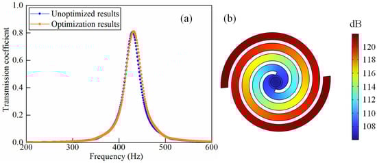 The WHO optimization results corresponded to the structural parameters , , and . Compared with the original structural parameters, the structural parameters were reduced to minimize the overall occupied space. After a numerical modeling of the optimized structural parameters, the comparison of sound absorption coefficients before and after optimization were obtained, as shown in Figure 10a, and the sound pressure level distribution is shown in Figure 10b. Compared with the original spatial spiral resonator, satisfactory noise reduction performance was maintained while improving space utilization. The optimization results show that the structural parameters of the spatial spiral resonator can be optimized in a targeted manner to improve space utilization and maximize the noise reduction effect after clarifying the noise frequency.