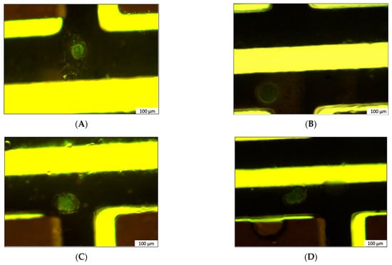 LCP samples containing the purified α4β2 nAChR-DCs during incubation in the RMP@LMx V.1.5 device. (A–D) Fluorescent microscopy images of “nucleation spots” characterized by the detection of GFP fluorescence belonging to the α4β2 nAChR-DCs. Every sample was dispensed in the capacitor area of the crystallization sample board to maximize its exposure to the determined voltage. All samples in this figure represent crystallization screenings with a constant voltage of 70 mV, ensuring minimal evaporation of the precipitants. At 0 mV (non-polarized control), no crystal formation was observed.