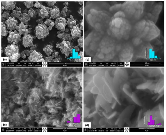 Figure 1 shows an SEM image of the as-synthesized flower-like ZnO nanostructures. The image was analyzed using ImageJ software (version 1.54j) to estimate the size of the nanoflowers (NFs), as well as the sizes of the nanopetals and nanoparticles, as shown in the inset of Figure 1. The zinc precursor and reaction temperature play a crucial role in determining the morphology of the synthesized ZnO samples. Figure 1a reveals highly uniform lotus-like ZnO nanostructures. Each nanoflower has an average size of approximately 1–1.5 μm, resembling a fully bloomed flower composed of leaf-like petals (350–400 nm in length) radiating from a central hexagonal cluster (Figure 1b). These nanopetals are made up of fine nanoparticles, approximately 20–40 nm in size, which aggregate electrostatically to form a petal-like arrangement (inset Figure 1b). Figure 1c illustrates a different morphology, resembling tulip-like ZnO nanostructures, characterized by the irregularly shaped nanosheets agglomerated in a flower-like arrangement. The average size of the tulip-like ZnO nanoflowers is 1.5–2 μm, as shown in the inset of Figure 1c. The nanosheets are approximately 20 nm thick, with lengths ranging from 200 to 400 nm, as shown in the inset of Figure 1d. The ZnO nanosheets possess a high surface area and active edge sites that facilitate the mobility of charge carriers [26], which is an important criterion for sunlight-driven photocatalyst materials.