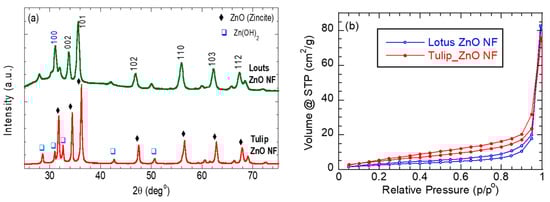 (a) XRD patterns and (b) of the synthesized tulip- and lotus-flower-like ZnO nanostructures.