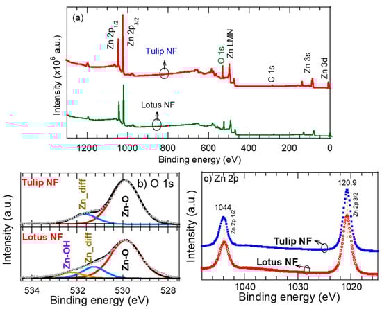 (a) Survey spectra and high-resolution spectra for (b) oxygen O 1s and (c) Zn 2p of lotus- and tulip-like ZnO nanoflowers.