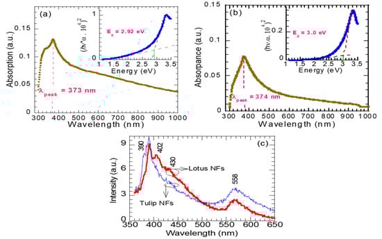 UV–Visible optical absorption and plots of (hν.α)2 versus hν of the synthesized (a) tulip- and (b) lotus-flower-like ZnO nanostructures. (c) PL spectra of ZnO NFs.