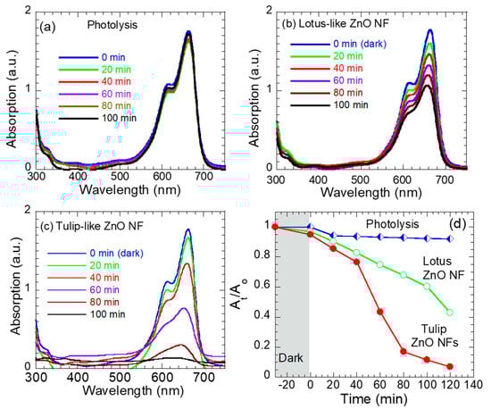 Moreover, the MB monomer peak at 667 cm−1 shifts towards lower wavelengths (a blue shift) as exposure time increases, particularly with the tulip-like ZnO NF, as shown in Figure 6a. This blue shift in the MB peak indicates the breakdown of the conjugated system, resulting in the formation of safer byproducts [44]. Figure 6d shows the normalized absorbance of ZnO NFs as a function of the exposure time, where Ao is the initial MB absorption and At is the MB absorption after exposure with light at a specified time. The tulip-like ZnO NFs clearly demonstrate a higher photodegradation rate over the entire reaction time. The degradation efficiency calculated as % Degradation was found to be 7.8% after 100 min of UV–Vis irradiation without ZnO NFs. In the presence of lotus-like and tulip-like ZnO NFs, the degradation efficiency increased to 40% and 90%, respectively. The degradation efficiency reported for the tulip-like ZnO NF is higher than previously reported values for ZnO-nanoflowers in MB degradation [23,26].