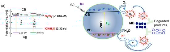 The mechanism of degradation MB using ZnO NF-like structures under UV–Vis radiation is depicted in Figure 7 and summarized by Equations (2)–(6). The empirical formulas and , are employed to determine the positions of the valence band (VB) and conduction band (CB) based on the optical bandgap energy values [45]. Here, χ = 5.89 eV represents the electronegativity of ZnO, and Ec = 4.5 eV is the energy of free electrons on the hydrogen scale. The estimated positions of the CB and VB for tulip-like and lotus-like ZnO NFs are depicted in the energy diagram in Figure 7a. Regardless of the NF type, holes in the VB with a potential greater than 2.32 can generate hydroxyl radicals . Similarly, the CB position is more negative than the O2/O2− redox potential, i.e., allowing electrons to readily interact with O2.