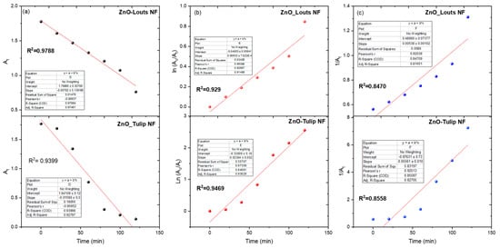 The plots of (a) At, (b) ln (Ao/At), and (c) (1/At) versus time along with their linear fits for MB dye in presence of ZnO NFs as photocatalysts.