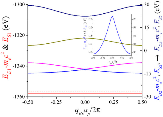 Figure 1 shows the five most negative energies as a function of the Bloch wavenumber for the Schrödinger (S) and Dirac (D) equations. The dashed lines correspond to S and the solid ones to D. The differences between the energies obtained with both equations are less than one hundredth of an eV (see the inset in Figure 1). This is expected, since the potential actuating on the electron is too small to induce relativistic behavior. Only for the most negative band, it is possible to appreciate some differences (in the shown scale) between the results from the S and D equations, which is about 0.1 eV. This band is similar to the known flat bands in solid-state physics (see Ref. [24] and the references therein). For the other bands, the energies are almost equal, except for the second band, where the difference can be seen on the appropriate scale.