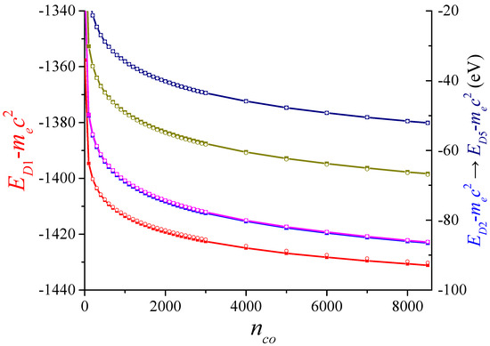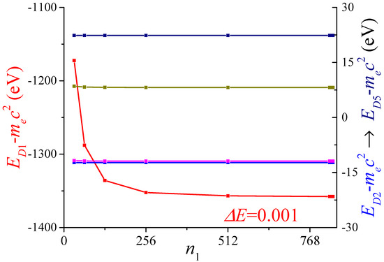 The parameter is set to 2200; then, the dimension of the matrix is . The partition number is fixed at 16384. The distance between the two atoms is , as is their diameter, and the longitude of the dimer structure is , so it constitutes a nanoparticle. The convergence criterion is .