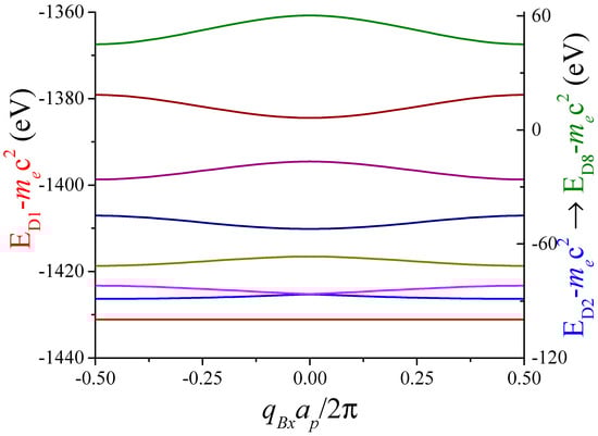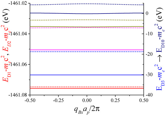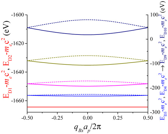 Unless otherwise specified, to obtain the eigenvalues, the infinite dimension of the matrix Equation (11) is truncated to . The parameter determines the dimension of the matrix, where . This matrix size guarantees compliance with the convergence criterion, meaning that the differences of energies obtained for the lowest negative band with and is lower than one thousandth of an electron volt.