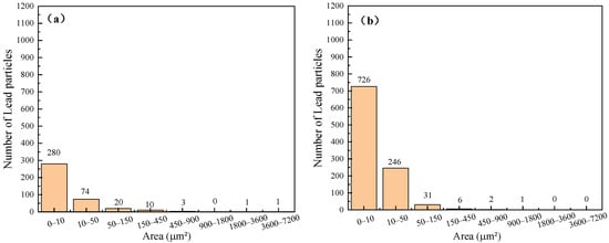 As can be seen from Figure 6, since the number of added SnSb particles increases, small particles increase, and large particles decrease. The number of SnSb particles in a range of less than or equal to 450 μm2 is the highest, with the content of the Zn 0.2 wt.% in the alloy about 4.6 times the number of the particles in the original sample, and the smallest average particle size is 72.8% lower than the original sample; the number of SnSb particles with Zn 0.1 wt.% decreases and the number of large particles increases; when the Zn content is 0.15%, the number of SnSb particles in the range of 0 to 450 μm2 is about 1.2 times that of the original sample, and the average particle size is small.