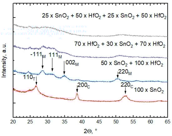 When the constituent oxide layer thickness was less than 5 nm, no distinct diffraction maxima were observed on the diffractogram (top pattern in Figure 1) of a four-layer laminate. Constituent layer thicknesses exceeding 10 nm enabled the appearance of a well-defined set of maxima, which allowed one to recognize the formation and presence of the monoclinic HfO2 and a mixture of cubic/tetragonal SnO2 (bottom two patterns in Figure 1).